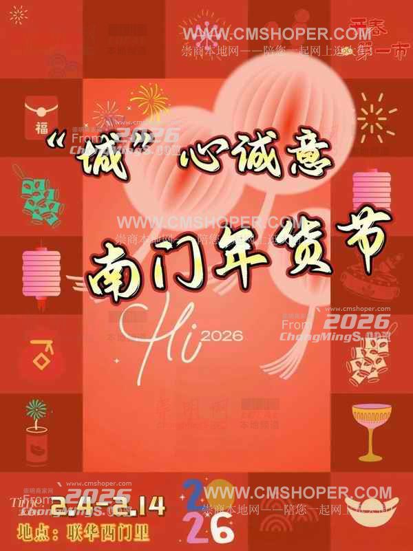 ChongMingS.COM崇明网讯 立春,岁首之始,万物新生。“城”心诚意南门年货节将于立春(2月4日)在联华西门里商圈,携春意、聚人气、纳万福,开启迎接2026马年新春的温暖序幕,这里不仅是年货采买的市集,更是立春迎祥、开年见喜的节庆现场,诚邀“年味主理人”,在开年第一市中,共创烟火,共迎春光。