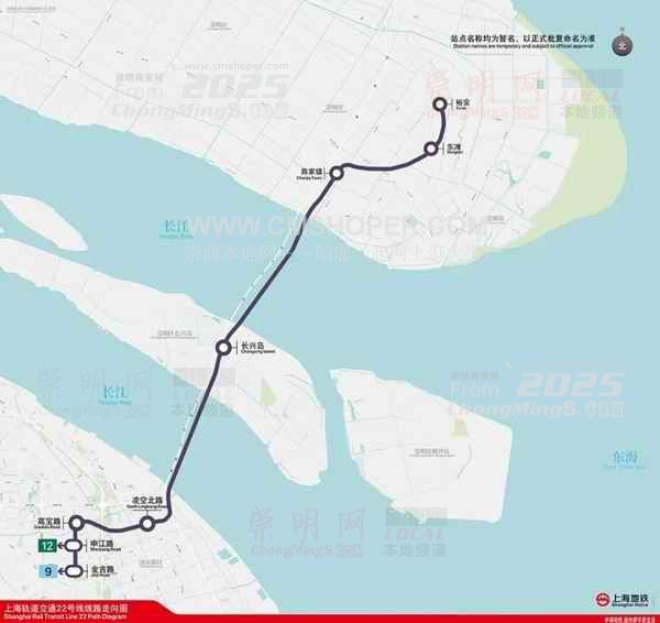 截至2025年10月25日,轨道交通22号线(崇明线)工程已实现全部车站主体结构封顶(共8座),盾构隧道全部贯通(共28条隧道,含越江大盾构南港和北港隧道),轨道铺设也已分段开工。