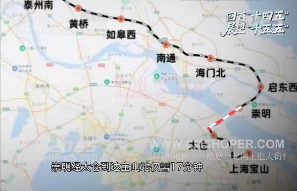 沪渝蓉高铁崇明站位于城桥镇湾南村,从南门驱车到崇明高铁站需要半小时左右。待高铁通车后,崇明经太仓到宝山站,仅需17分钟,衔接19号线。